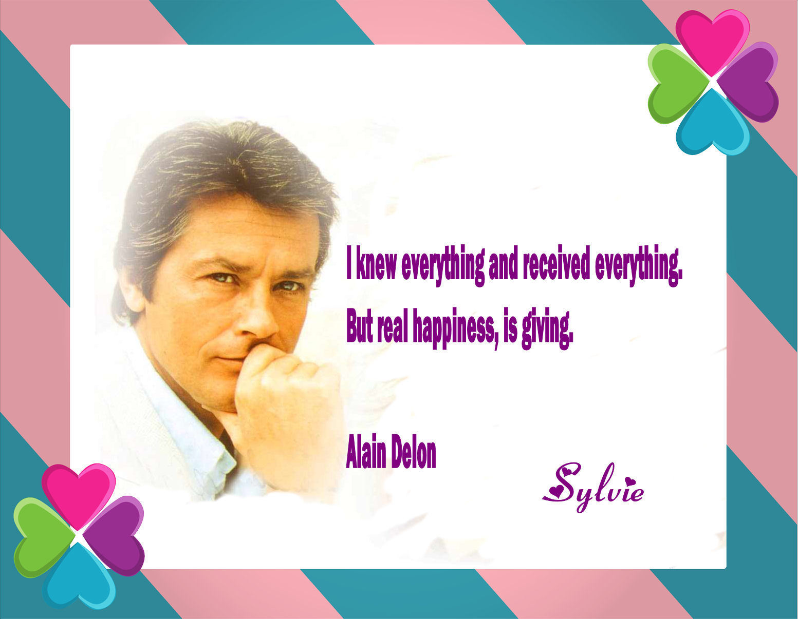 Alain Fabien Maurice Marcel Delon is a French actor and businessman, with French-Swiss dual citizenship since 1999. Delon became one of Europe's most prominent actors and screen "heart throbs" in the 1960s. He achieved critical acclaim for roles in films such as Rocco and His Brothers , Purple Noon , L'Eclisse , The Leopard , Lost Command and Le Samouraï . Over the course of his career Delon worked with many well-known directors, including Luchino Visconti, Jean-Luc Godard, Jean-Pierre Melville, Michelangelo Antonioni and Louis Malle... (wikipedia)