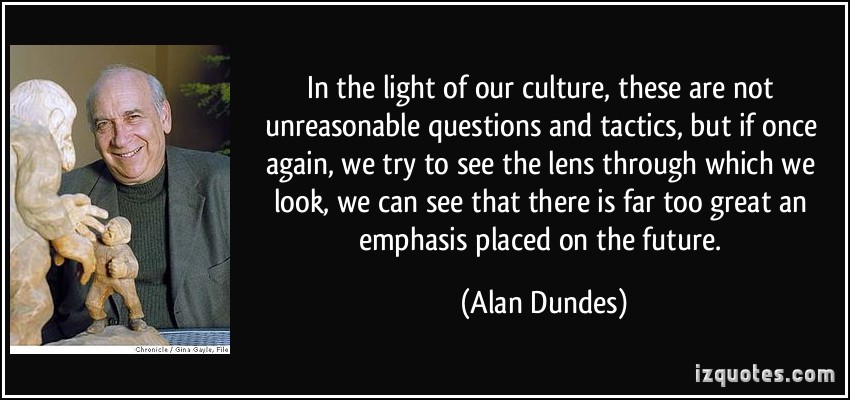 Alan Dundes was a folklorist at the University of California, Berkeley. His work was said to have been central to establishing the study of folklore as an academic discipline. He wrote 12 books, both academic and popular, and edited or co-wrote two dozen more. One of his most notable articles was called "Seeing is Believing" in which he indicated that Americans value the sense of sight more than the other senses... (wikipedia)