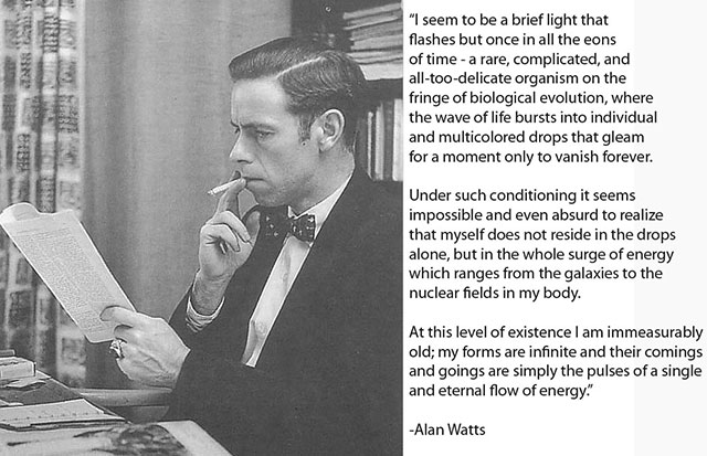 Alan Wilson Watts was a British-born philosopher, writer, and speaker, best known as an interpreter and populariser of Eastern philosophy for a Western audience. Born in Chislehurst, England, he moved to the United States in 1938 and began Zen training in New York. Pursuing a career, he attended Seabury-Western Theological Seminary, where he received a master's degree in theology. Watts became an Episcopal priest in 1945, then left the ministry in 1950 and moved to California, where he joined the faculty of the American Academy of Asian Studies... (wikipedia)