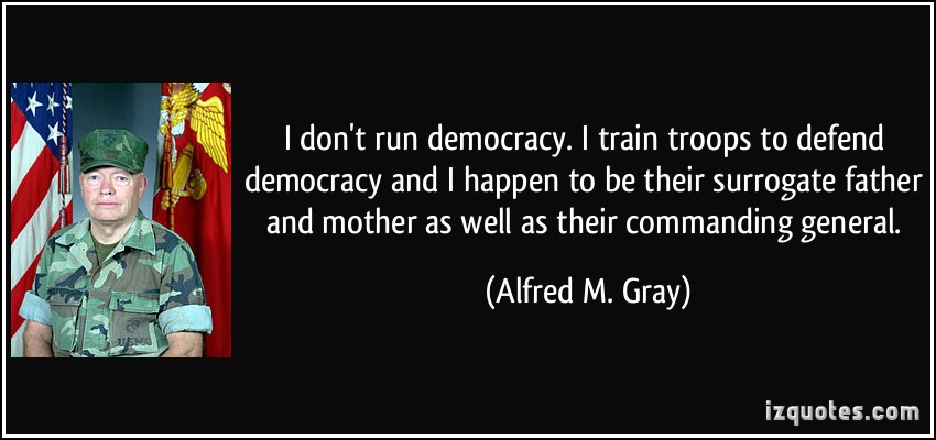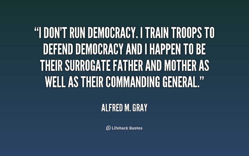 I don't run democracy. I train troops to defend democracy and I happen to be their surrogate father and mother as well as their commanding general.