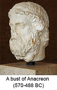 Anacreon was a Greek lyric poet, notable for his drinking songs and hymns. Later Greeks included him in the canonical list of nine lyric poets... (wikipedia)