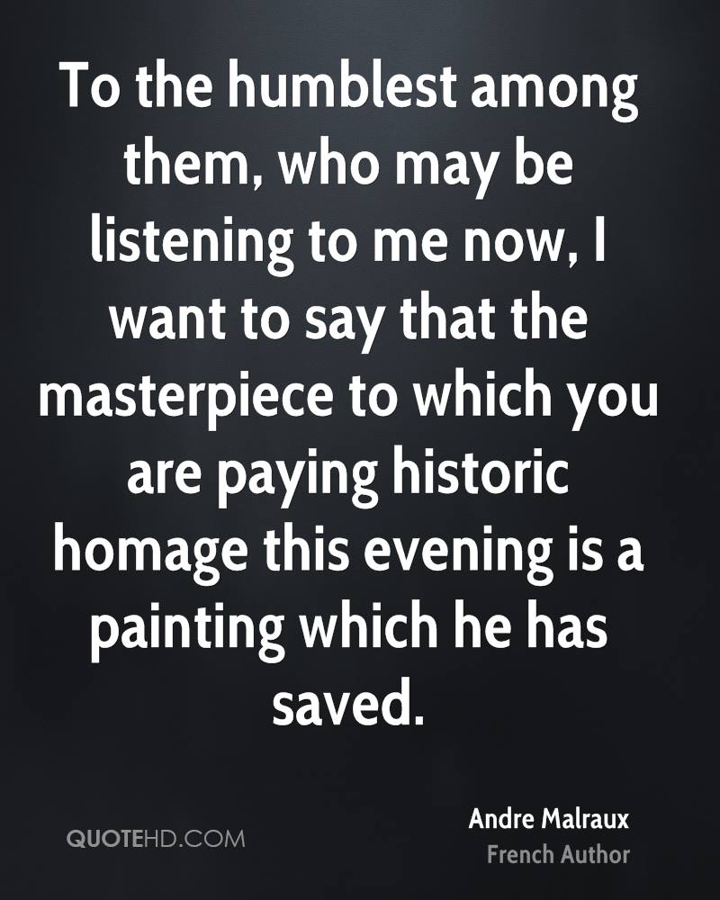 André Malraux DSO was a French novelist, art theorist and Minister of Cultural Affairs. Malraux's novel La Condition Humaine (Man's Fate) won the Prix Goncourt. He was appointed by President Charles de Gaulle as Minister of Information and subsequently as France's first Minister of Cultural Affairs during de Gaulle's presidency ... (wikipedia)