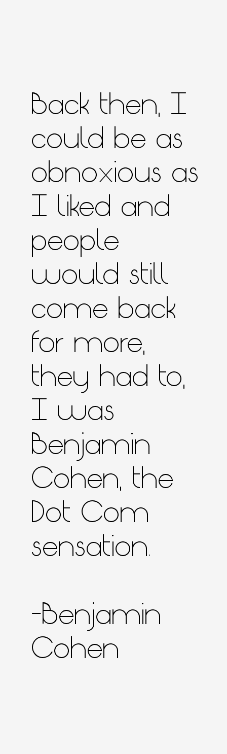 Back then, I could be as obnoxious as I liked and people would still come back for more, they had to, I was Benjamin Cohen, the Dot Com sensation.