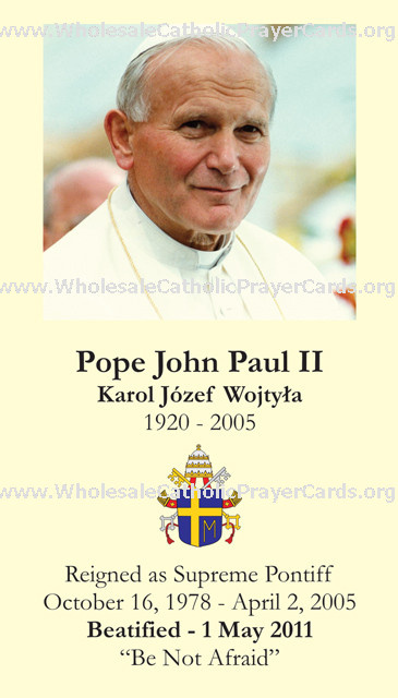 Pope John Paul II, born Karol Jozef Wojtya, served as Pope from 1978 to 2005. He was elected by the second Papal conclave of 1978, which was called after Pope John Paul I, who was elected in August after the death of Pope Paul VI, died after thirty-three days. Then-Cardinal Wojtya was elected on the third day of the conclave and adopted his predecessor's name in tribute to him. In the years since his death, John Paul II has been declared a saint by the Roman Catholic Church. He is referred to by Roman Catholics as Pope Saint John Paul II or Saint John Paul the Great, for example as a name for institutions... (wikipedia)