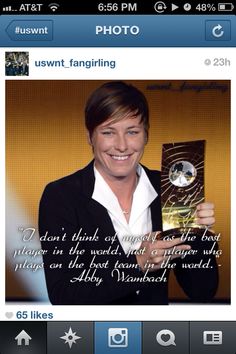 Mary Abigail "Abby" Wambach is an American soccer player, coach, two-time Olympic gold medalist and FIFA Women's World Cup champion. A six-time winner of the U.S. Soccer Athlete of the Year award, Wambach has been a regular on the U.S. women's national soccer team since 2003 earning her first cap in 2001. As a forward, she currently stands as the highest all-time goal scorer for the national team and holds the world record for international goals for both female and male soccer players with 184 goals. In 2012, Wambach was awarded the 2012 FIFA World Player of the Year, becoming the first American woman to win the award in ten years. In May 2015, she was included in Time Magazine's Time 100 list as one of the 100 most influential people in the world... (wikipedia)