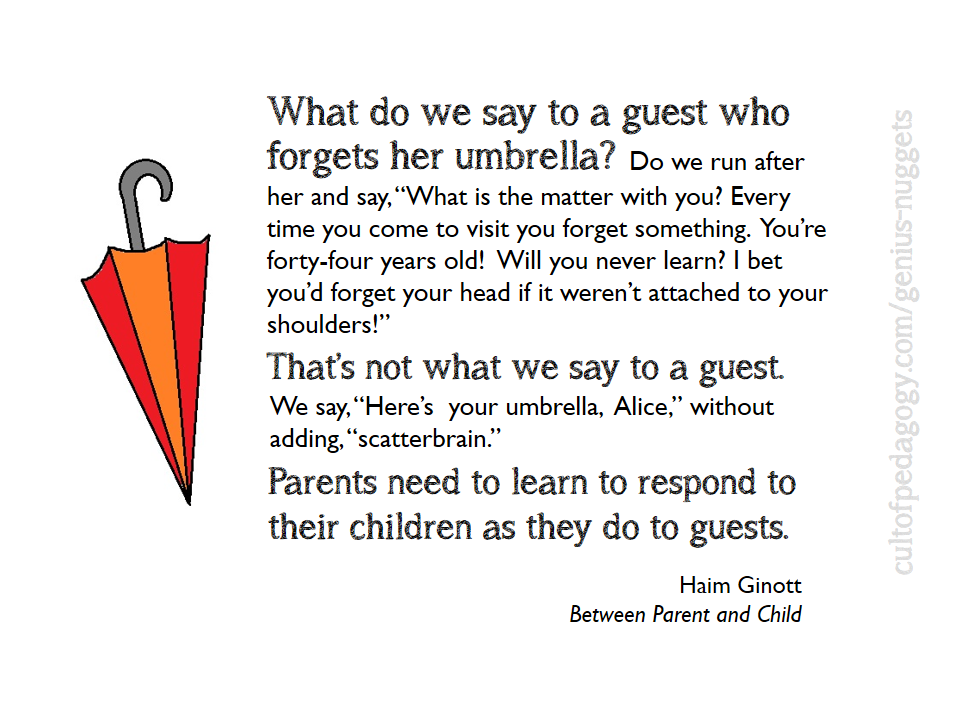 Haim G. Ginott was a school teacher, a child psychologist and psychotherapist and a parent educator. He pioneered techniques for conversing with children that are still taught today. His book, Between Parent and Child, stayed on the best seller list for over a year and is still popular today. This book sets out to give "specific advice derived from basic communication principles that will guide parents in living with children in mutual respect and dignity.".. (wikipedia)