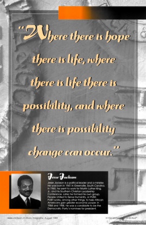 Reverend Jesse Louis Jackson, Sr. is an American civil rights activist, Baptist minister, and politician. He was a candidate for the Democratic presidential nomination in 1984 and 1988 and served as a shadow U.S. Senator for the District of Columbia from 1991 to 1997. He is the founder of the organizations that merged to form Rainbow/PUSH. Former U.S. Representative Jesse Jackson, Jr. is his eldest son. Jackson was also the host of Both Sides with Jesse Jackson on CNN from 1992 to 2000... (wikipedia)