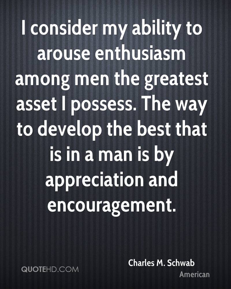 I consider my ability to arouse enthusiasm among men the greatest asset I possess. The way to develop the best that is in a man is by appreciation and encouragement.