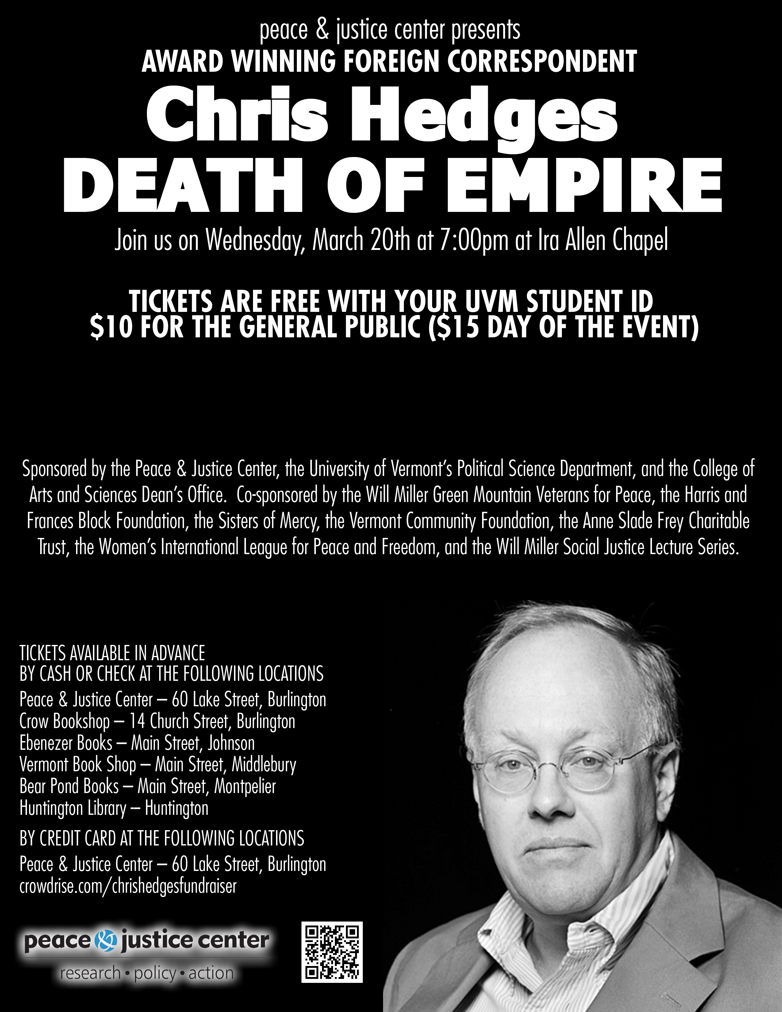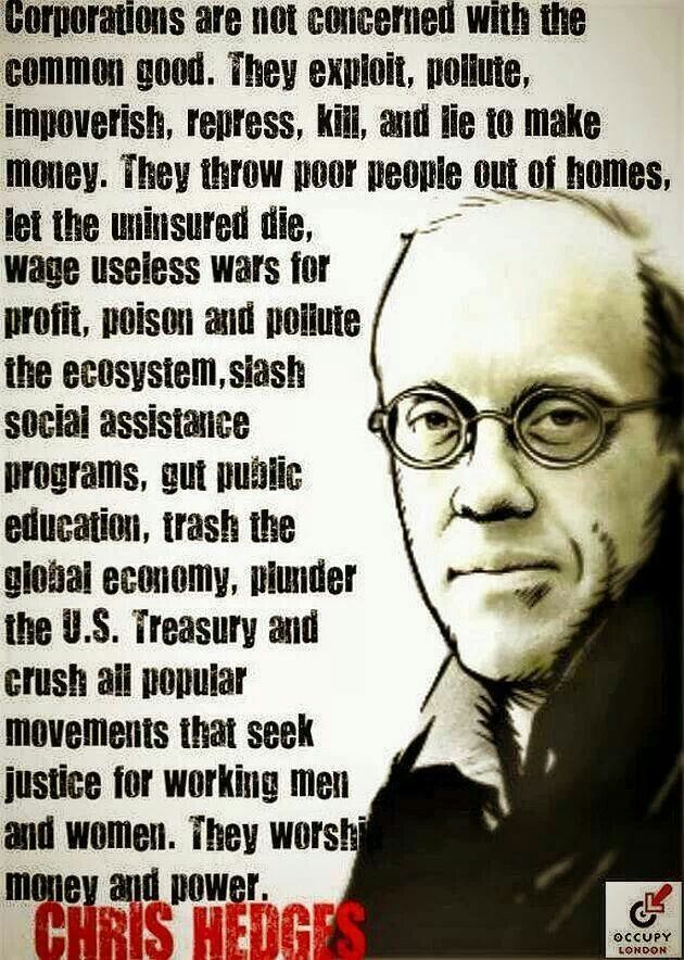 Christopher Lynn "Chris" Hedges is an American journalist, activist, author, and Presbyterian minister. Hedges is also known as the best-selling author of several books including War Is a Force That Gives Us Meaning —a finalist for the National Book Critics Circle Award for Nonfiction—Empire of Illusion: The End of Literacy and the Triumph of Spectacle , Death of the Liberal Class , the New York Times best seller, written with cartoonist Joe Sacco, Days of Destruction, Days of Revolt , and his most recent Wages of Rebellion: The Moral Imperative of Revolt ... (wikipedia)
