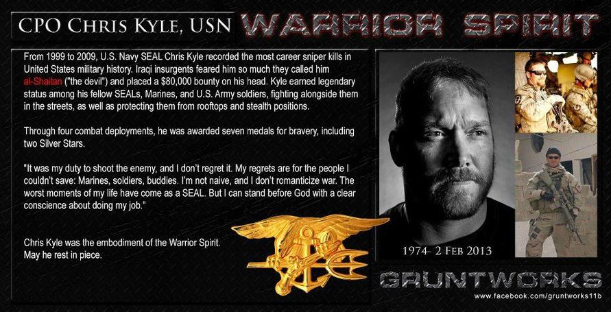 Christopher Scott "Chris" Kyle was a United States Navy SEAL and the most lethal sniper in U.S. military history, with over 160 kills officially confirmed by the Department of Defense. Kyle served four tours in the Iraq War and was awarded several commendations for acts of heroism and meritorious service in combat. He received two Silver Star Medals, five Bronze Star Medals, one Navy and Marine Corps Commendation Medal, two Navy and Marine Corps Achievement Medals and numerous other unit and personal awards... (wikipedia)