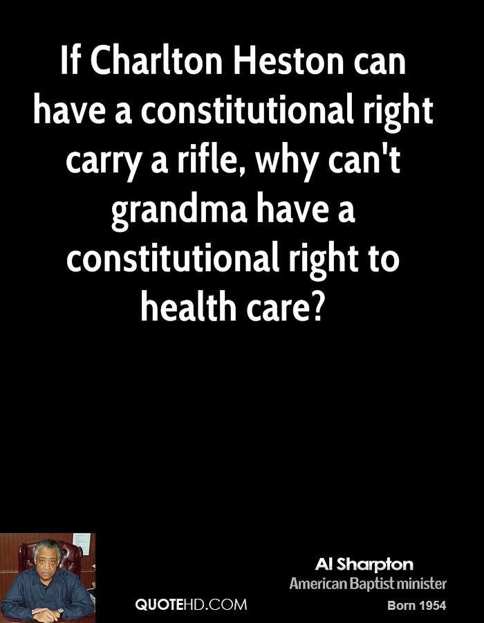 If Charlton Heston can have a constitutional right carry a rifle, why can't grandma have a constitutional right to health care?