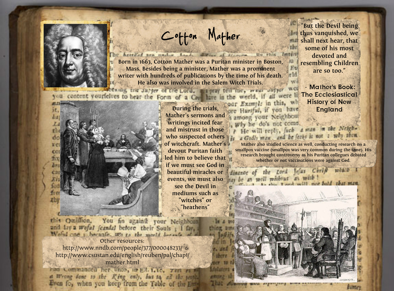 Cotton Mather, FRS was a socially and politically influential New England Puritan minister, prolific author, and pamphleteer. Known for his vigorous support for the Salem witch trials, he also left a scientific legacy due to his hybridization experiments and his promotion of inoculation for disease prevention. He was subsequently denied the Presidency of Harvard College which his father, Increase, had held... (wikipedia)