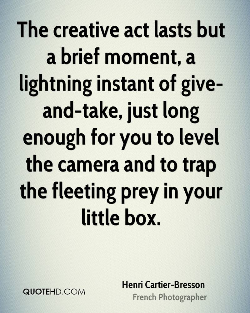 The creative act lasts but a brief moment, a lightning instant of give-and-take, just long enough for you to level the camera and to trap the fleeting prey in your little box.