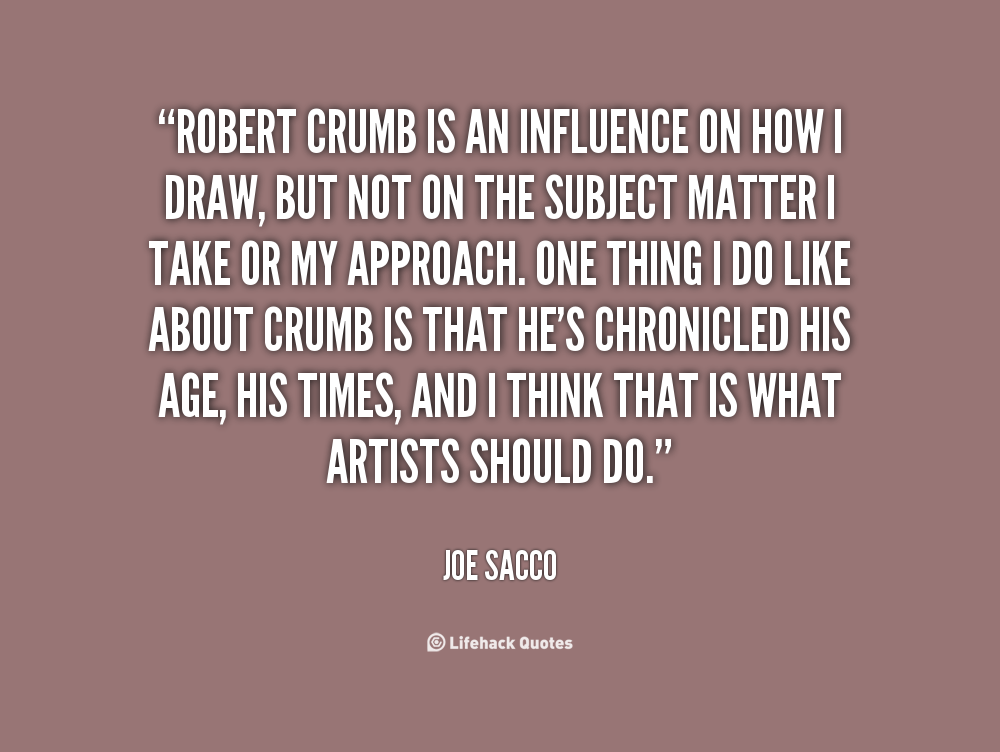 Robert Crumb is an influence on how I draw, but not on the subject matter I take or my approach. One thing I do like about Crumb is that he's chronicled his age, his times, and I think that is what artists should do.