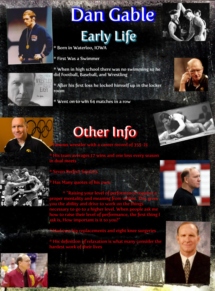 Danny Mack "Dan" Gable is a retired American Olympic wrestler and head coach. He is best known for his tenure as head coach at the University of Iowa where he won 15 NCAA team titles between 1976 and 1997. He is also famous for having only lost one match in his entire Iowa State University collegiate career – his last – and winning a gold medal at the 1972 Olympic Games in Munich, Germany, while not giving up a single point. October 25, 2013 was recognized as Dan Gable Day in Iowa... (wikipedia)