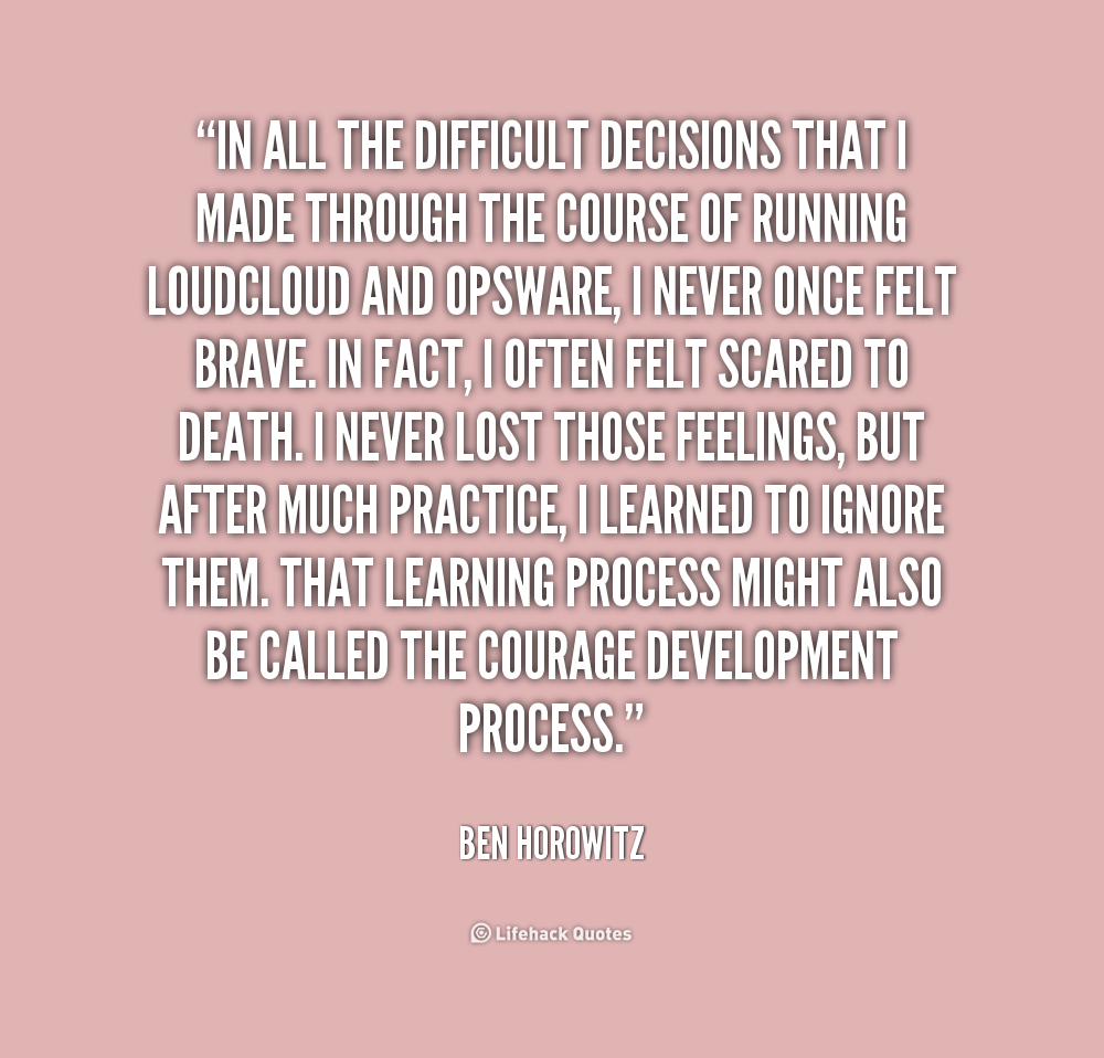 In all the difficult decisions that I made through the course of running Loudcloud and Opsware, I never once felt brave. In fact, I often felt scared to death. I never lost those feelings, but after much practice, I learned to ignore them. That learning process might also be called the courage development process.
