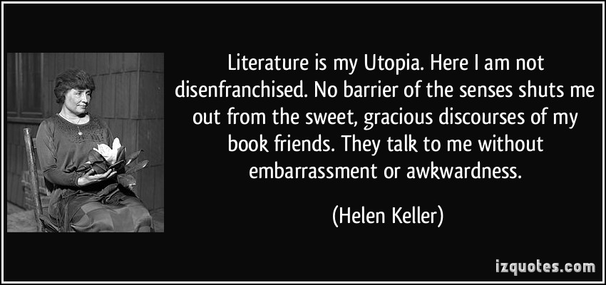 Literature is my Utopia. Here I am not disenfranchised. No barrier of the senses shuts me out from the sweet, gracious discourses of my book friends. They talk to me without embarrassment or awkwardness.