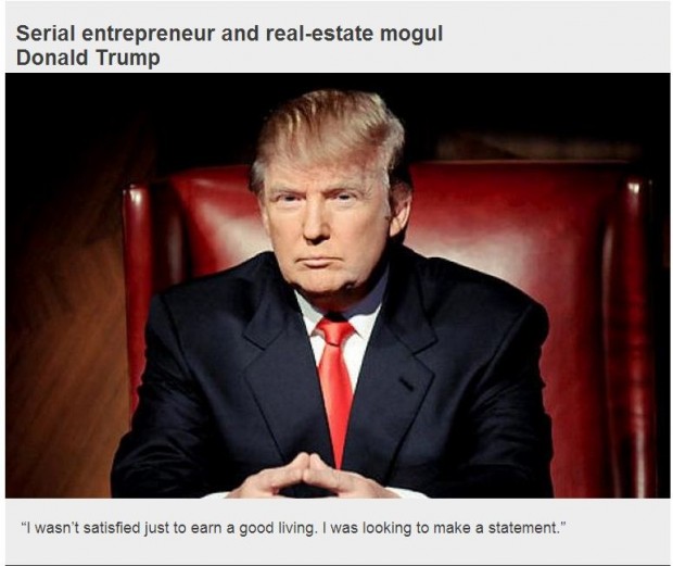 Donald John Trump is an American real estate magnate, television personality, politician, and author. He is the chairman and president of The Trump Organization and the founder of Trump Entertainment Resorts. Trump's branding efforts, business career, outspoken manner, media appearances, and books have made him a celebrity. He hosted The Apprentice, a U.S. television program on NBC... (wikipedia)