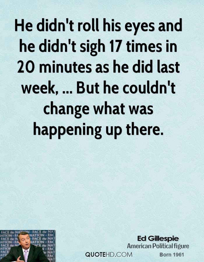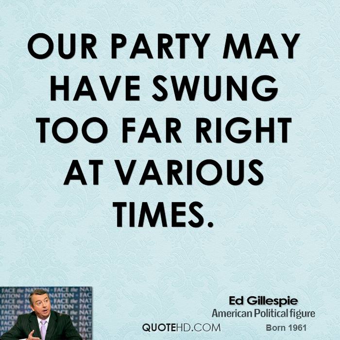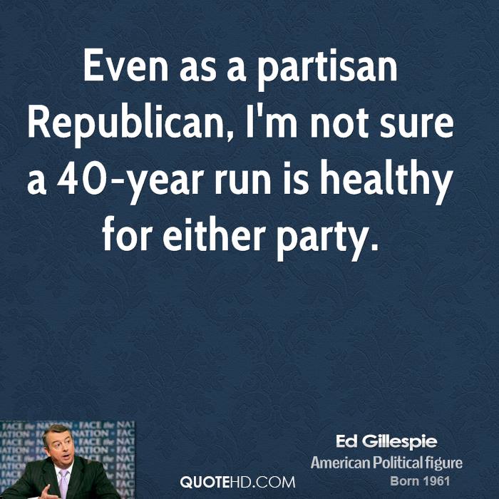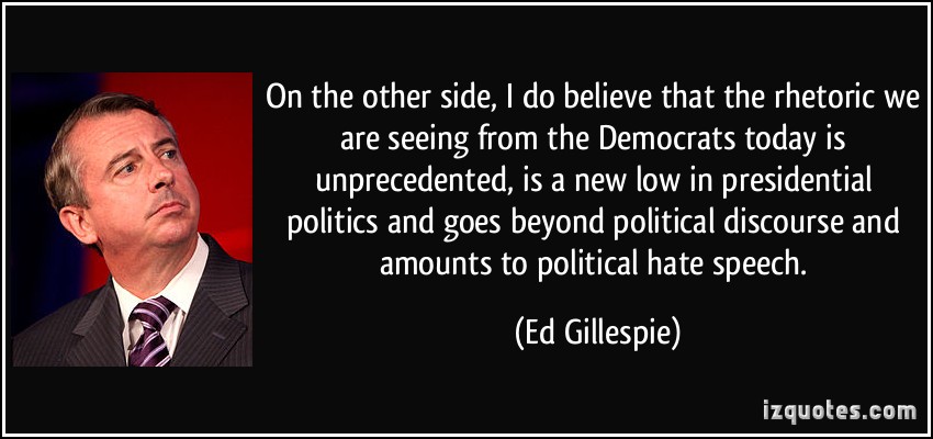 Edward Walter "Ed" Gillespie is an American Republican political strategist who served as the 61st Chairman of the Republican National Committee and Counselor to the President in the George W. Bush administration. Gillespie, along with Democrat Jack Quinn, founded Quinn Gillespie & Associates, a bipartisan lobbying firm. Gillespie is also the founder of Ed Gillespie Strategies, a strategic consulting firm that provides high-level advice to companies and CEOs, coalitions, and trade associations. In January 2014, Gillespie announced he was running for Virginia's U.S. Senate seat currently held by Mark Warner in the 2014 election, and on June 7, 2014, he received the Republican nomination. In October 2015, Gillespie announced his plans to run for Governor of Virginia in 2017.. (wikipedia)