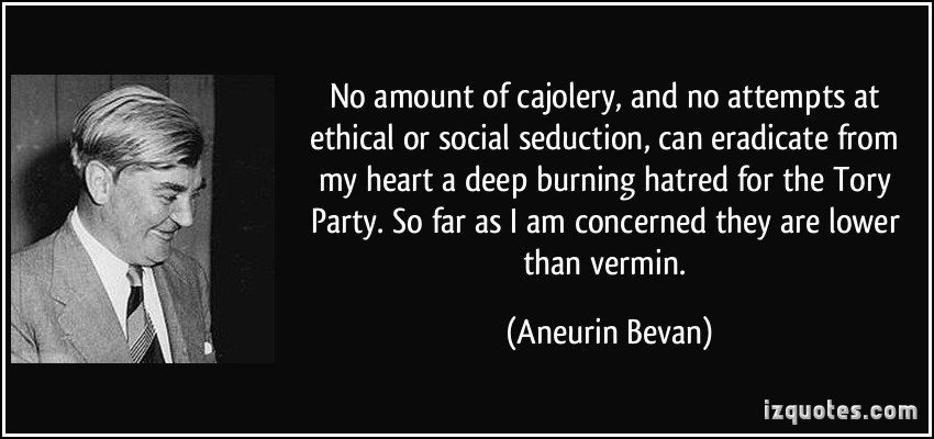 No amount of cajolery, and no attempts at ethical or social seduction, can eradicate from my heart a deep burning hatred for the Tory Party. So far as I am concerned they are lower than vermin.