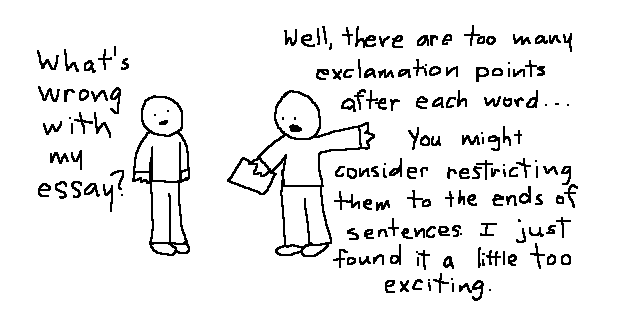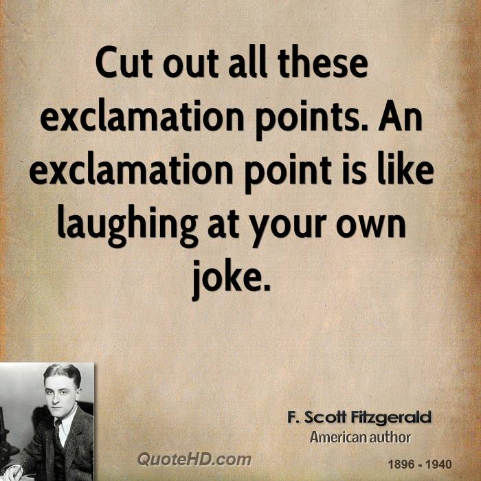 Cut out all these exclamation points. An exclamation point is like laughing at your own joke.
