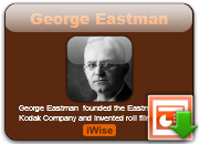 George Eastman was an American innovator and entrepreneur who founded the Eastman Kodak Company and popularized the use of roll film, helping to bring photography to the mainstream. Roll film was also the basis for the invention of motion picture film in 1888 by the world's first film-makers Eadweard Muybridge and Louis Le Prince, and a few years later by their followers Léon Bouly, Thomas Edison, the Lumière Brothers, and Georges Méliès... (wikipedia)