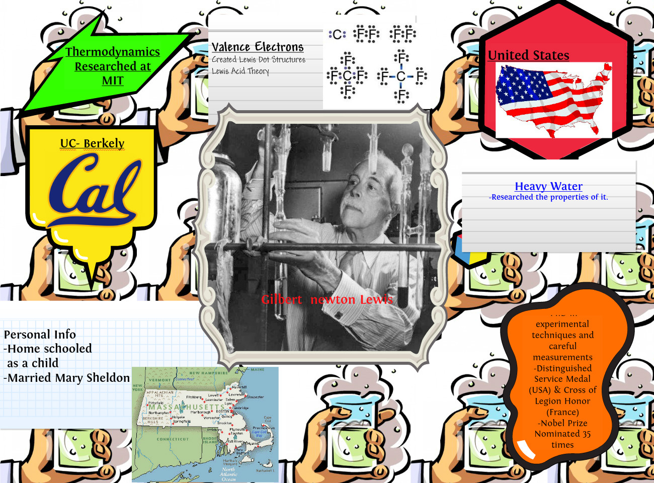 Gilbert Newton Lewis ForMemRS was an American physical chemist known for the discovery of the covalent bond and his concept of electron pairs; his Lewis dot structures and other contributions to valence bond theory have shaped modern theories of chemical bonding. Lewis successfully contributed to thermodynamics, photochemistry, and isotope separation, and is also known for his concept of acids and bases... (wikipedia)
