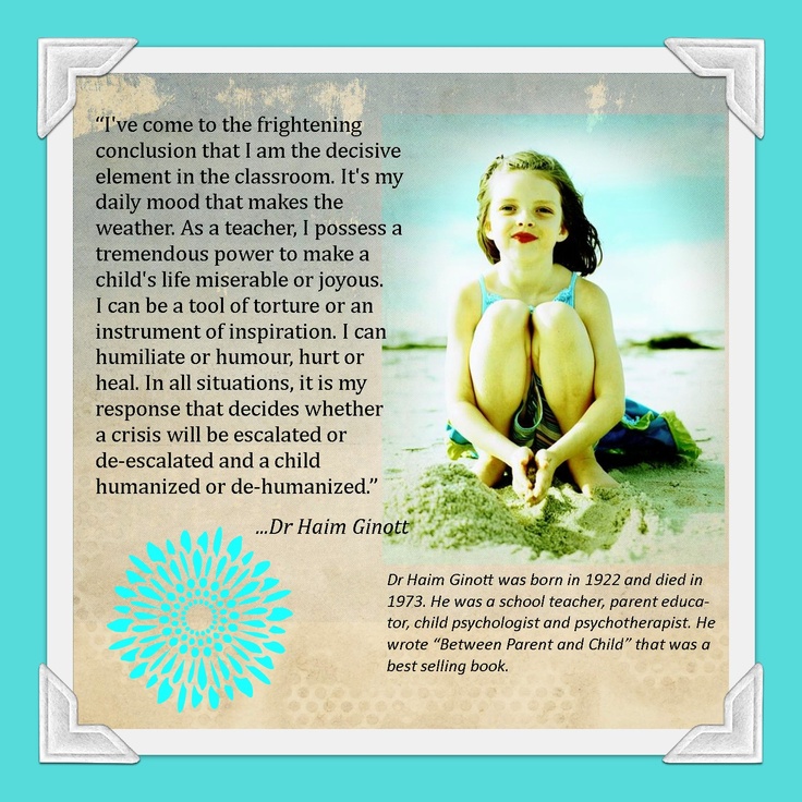 Haim G. Ginott was a school teacher, a child psychologist and psychotherapist and a parent educator. He pioneered techniques for conversing with children that are still taught today. His book, Between Parent and Child, stayed on the best seller list for over a year and is still popular today. This book sets out to give "specific advice derived from basic communication principles that will guide parents in living with children in mutual respect and dignity.".. (wikipedia)