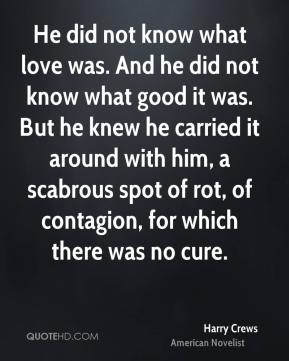 He did not know what love was. And he did not know what good it was. But he knew he carried it around with him, a scabrous spot of rot, of contagion, for which there was no cure.