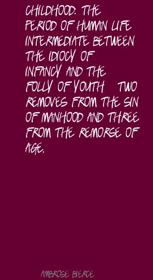 Childhood: the period of human life intermediate between the idiocy of infancy and the folly of youth - two removes from the sin of manhood and three from the remorse of age.