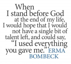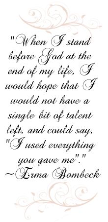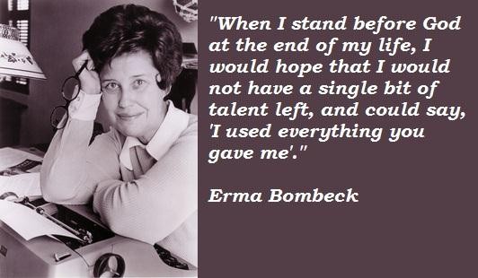 Erma Louise Bombeck was an American humorist who achieved great popularity for her newspaper column that described suburban home life from the mid-1960s until the late 1990s. Bombeck also published 15 books, most of which became bestsellers. From 1965 to 1996, Erma Bombeck wrote over 4,000 newspaper columns, using broad and sometimes eloquent humor, chronicling the ordinary life of a midwestern suburban housewife. By the 1970s, her columns were read twice-weekly by 30 million readers of the 900 newspapers in the U.S. and Canada... (wikipedia)