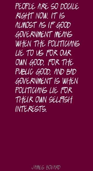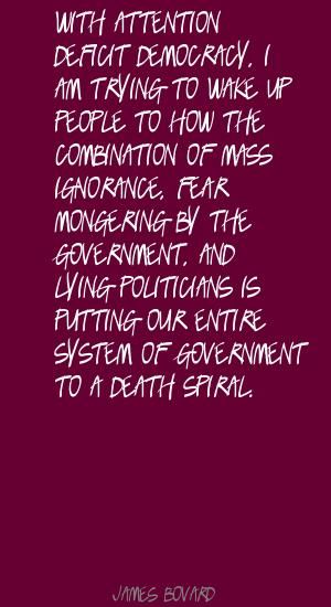 James Bovard is a libertarian author and lecturer whose political commentary targets examples of waste, failures, corruption, cronyism and abuses of power in government. He is the author of Attention Deficit Democracy, and eight other books. He has written for the New York Times, Wall Street Journal, Washington Post, New Republic, Reader's Digest, The American Conservative, and many other publications. His books have been translated into Spanish, Arabic, Japanese, and Korean... (wikipedia)