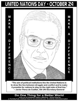 Javier Felipe Ricardo Pérez de Cuéllar y de la Guerra KCMG is a Peruvian diplomat who served as the fifth Secretary-General of the United Nations from January 1, 1982 to December 31, 1991. In 1995, he ran unsuccessfully against Alberto Fujimori for President of Peru. He was President of the Council of Ministers, as well as Minister of Foreign Affairs from November 2000 until July 2001, during the turbulent period following Fujimori's resignation over corruption charges. In September 2004, he stepped down from his position as Peru's Ambassador to France, where he formerly resided. With the death of Kurt Waldheim in June 2007, he became the oldest former Secretary General of the United Nations. He is also a member of the Club de Madrid, a group of more than 100 former Presidents and Prime Ministers of democratic countries, which works to strengthen democracy worldwide... (wikipedia)