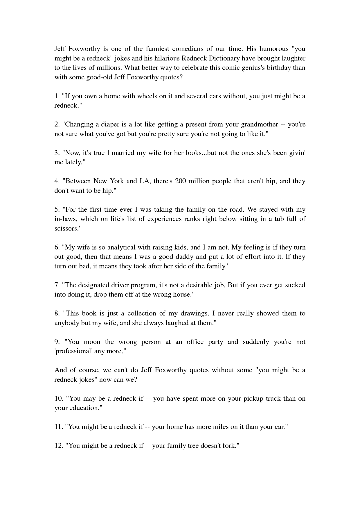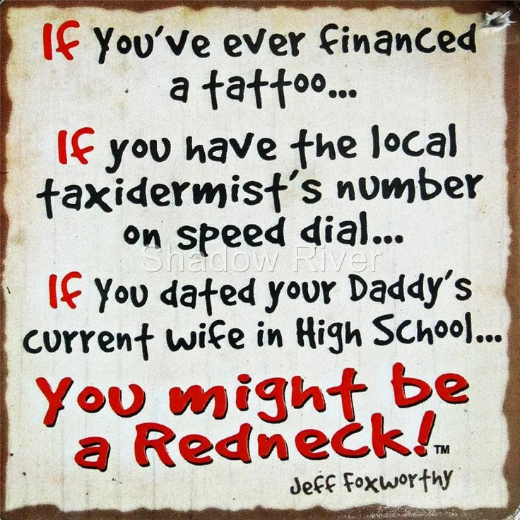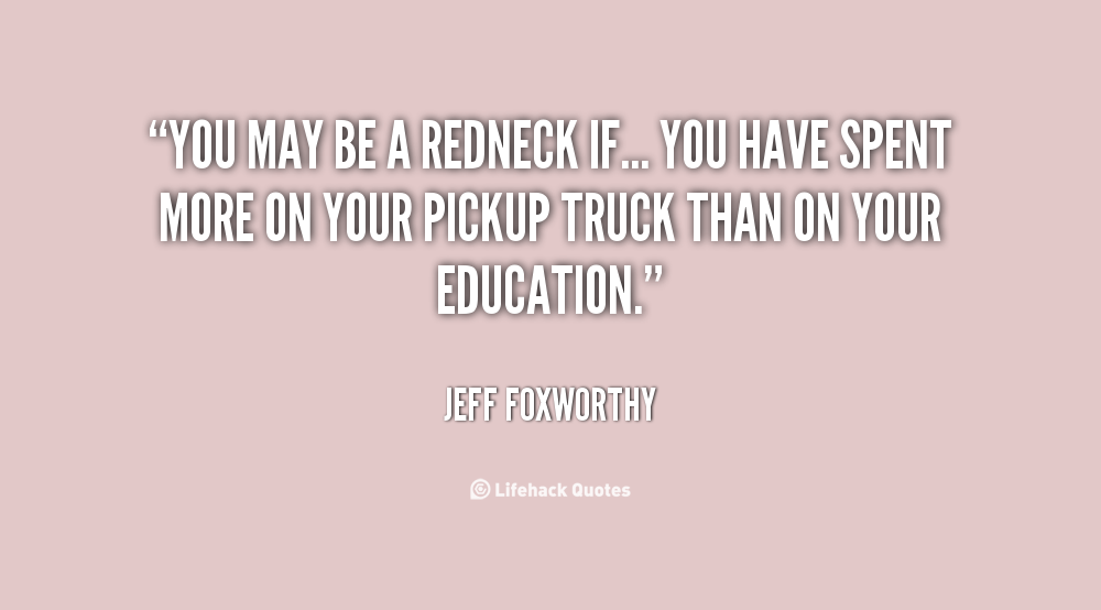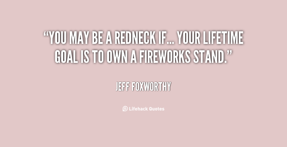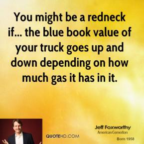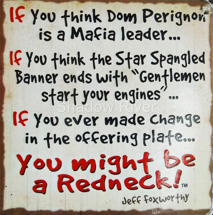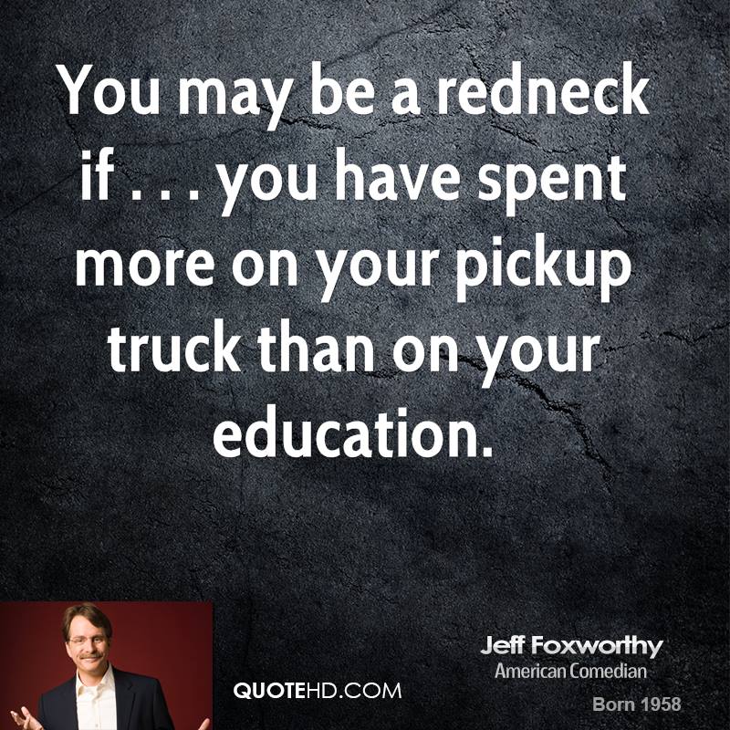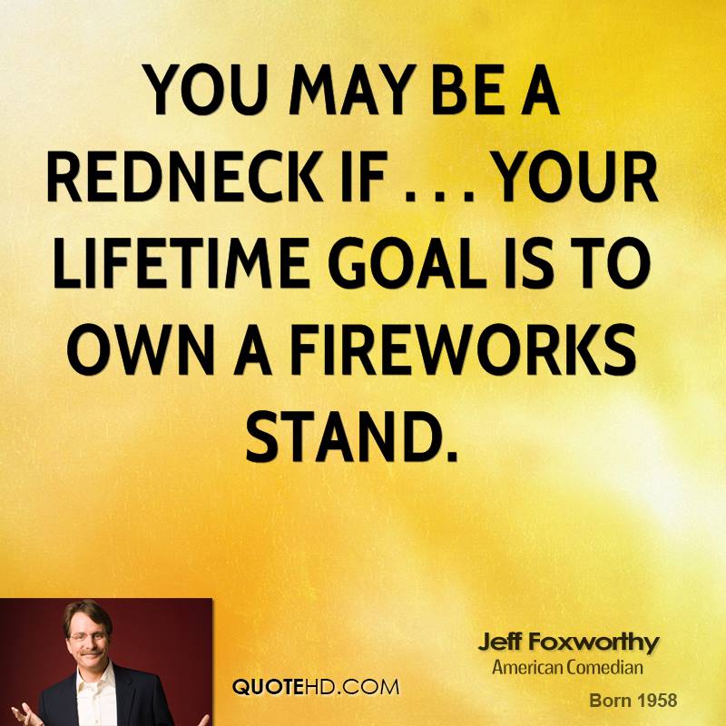 Jeffrey Marshall "Jeff" Foxworthy is an American stand-up comedian, actor, television and radio personality, author, and voice artist. He is a member of the Blue Collar Comedy Tour, a comedy troupe which also comprises Larry the Cable Guy, Bill Engvall, and Ron White. Known for his "You might be a redneck" one-liners, Foxworthy has released six major-label comedy albums. His first two albums were each certified 3× Platinum by the Recording Industry Association of America. Foxworthy has written several books based on his redneck jokes, as well as an autobiography entitled No Shirt, No Shoes... No Problem!... (wikipedia)