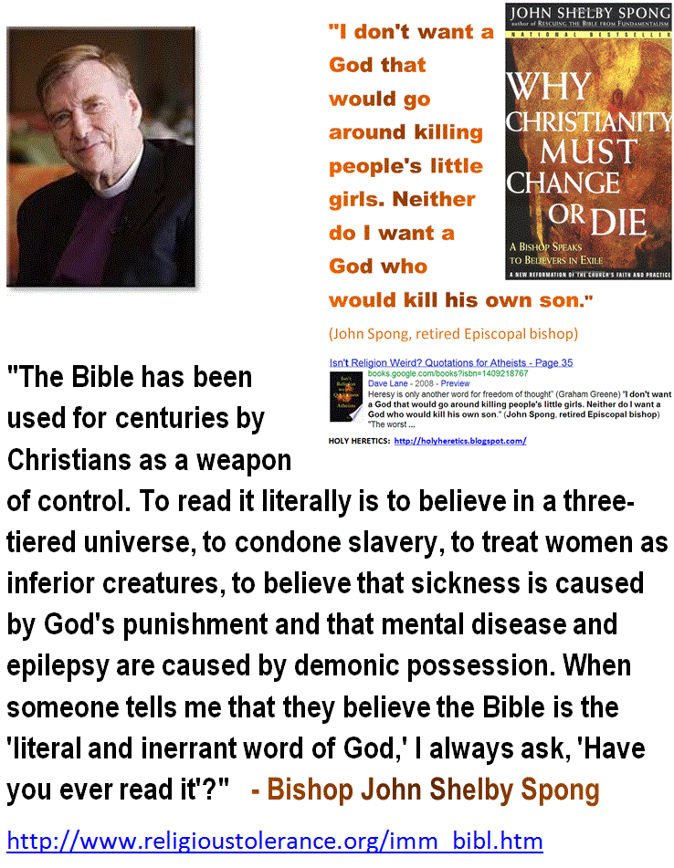 John Shelby "Jack" Spong is a retired American bishop of the Episcopal Church. From 1979 to 2000 he was Bishop of Newark. He is a liberal Christian theologian, religion commentator and author. He calls for a fundamental rethinking of Christian belief away from theism and traditional doctrines... (wikipedia)