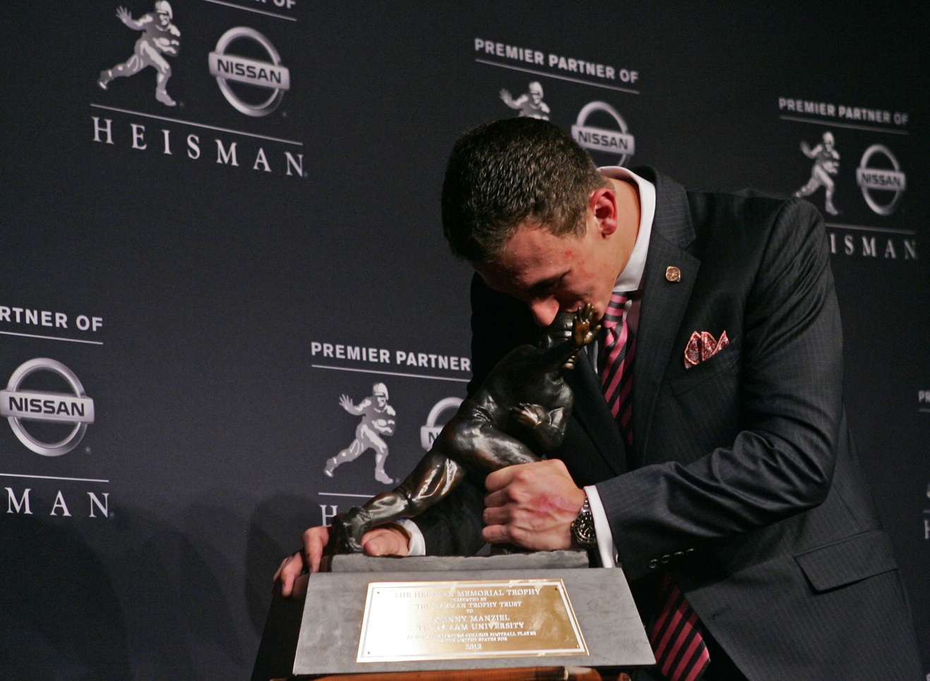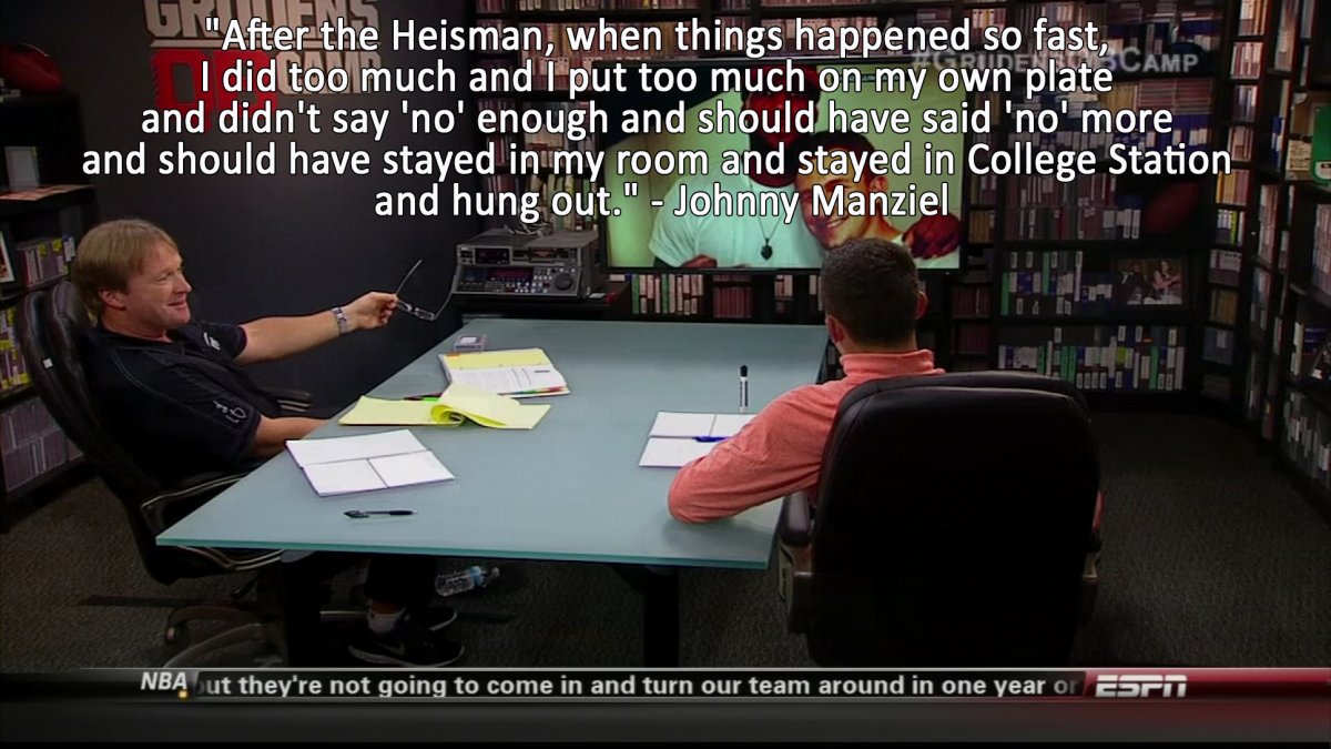 Jonathan Paul Manziel, is an American football quarterback for the Cleveland Browns of the National Football League. He was drafted by the Browns with the 22nd overall pick of the 2014 NFL Draft. He was nationally recruited out of high school as a dual-threat quarterback. In 2012, Manziel debuted for the Texas A&M Aggies as a redshirt freshman in Kevin Sumlin's Air Raid offense during A&M's first season in the Southeastern Conference. He broke numerous NCAA Division I FBS and SEC records, which include becoming the first freshman and fifth player in NCAA history to pass for 3,000 yards and rush for 1,000 yards in a season. At the end of the regular season, he became the first freshman to win the Heisman Trophy,Manning Award, and the Davey O'Brien National Quarterback Award. Manziel capitalized on his redshirt freshman season by leading Texas A&M to a 41–13 victory over Oklahoma in the 2013 Cotton Bowl Classic... (wikipedia)