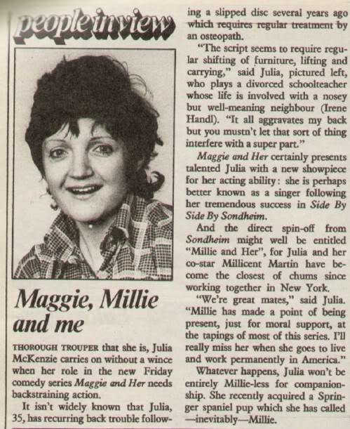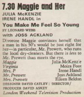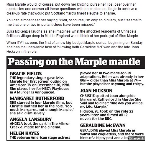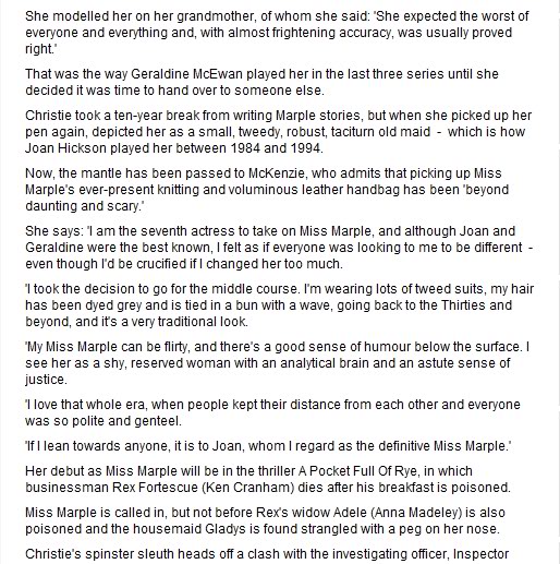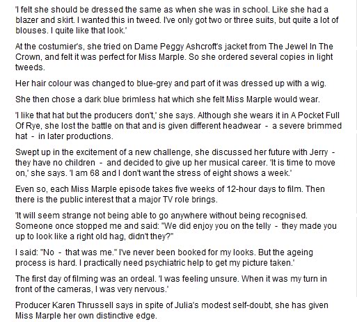 Julia McKenzie is an English actress, singer and theatre director. On television, she is known for her BAFTA Award nominated role as Hester Fields in the sitcom Fresh Fields, its sequel French Fields, and as Miss Marple in Agatha Christie's Marple... (wikipedia)