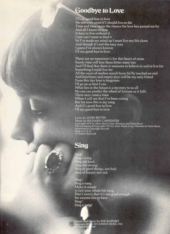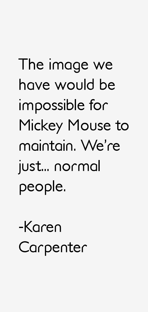 Karen Anne Carpenter was an American singer and drummer. She and her brother, Richard Carpenter, formed the 1970s duo The Carpenters. Although her skills as a drummer earned admiration from drumming luminaries and peers, she is best known for her vocal performances. She had a contralto vocal range... (wikipedia)