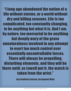 Kay Redfield Jamison is an American clinical psychologist and writer. Her work has centered on bipolar disorder, which she has had since her early adulthood. She holds a post of Professor of Psychiatry at the Johns Hopkins University School of Medicine and is an Honorary Professor of English at the University of St Andrews... (wikipedia)