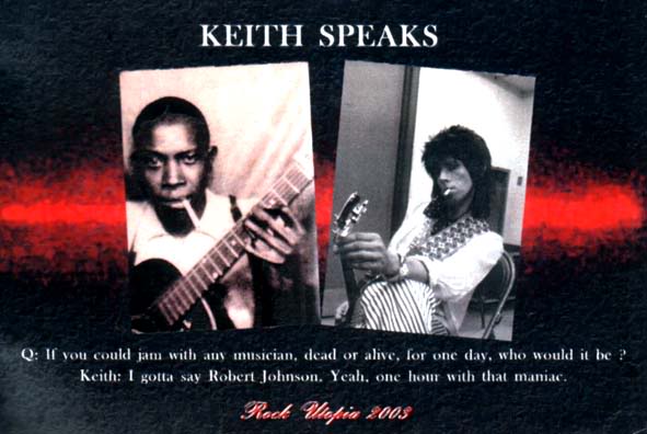 Keith Richards is an English musician, singer and songwriter, actor, and one of the original members of the rock band The Rolling Stones. Rolling Stone Magazine credited Richards for "rock's greatest single body of riffs" on guitar and ranked him 4th on its list of 100 best guitarists. Fourteen songs that Richards wrote with the Rolling Stones' lead vocalist Mick Jagger are listed among Rolling Stone magazine's "500 Greatest Songs of All Time". The Stones are generally known for their guitar interplay of rhythm and lead with Brian Jones, Mick Taylor and Ronnie Wood over the years. In spite of this, Richards plays the only guitar tracks on some of their most famous songs including "Paint It Black", "Ruby Tuesday", "Sympathy for the Devil", and "Gimme Shelter"... (wikipedia)
