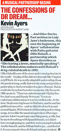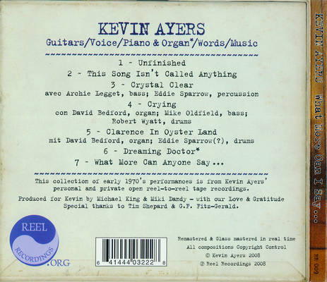 Kevin Ayers was an English singer-songwriter and a major influential force in the English psychedelic movement. Ayers was a founding member of the pioneering psychedelic band Soft Machine in the mid-1960s, and was closely associated with the Canterbury scene. He recorded a series of albums as a solo artist and over the years worked with Brian Eno, Syd Barrett, John Cale, Elton John, Robert Wyatt, Andy Summers, Mike Oldfield, Nico and Ollie Halsall, among others. After living for many years in Deià, Majorca, he returned to the United Kingdom in the mid-1990s before moving to the south of France. His last album was The Unfairground, recorded in New York City, Tucson, and London in 2006. The British rock journalist Nick Kent wrote: "Kevin Ayers and Syd Barrett were the two most important people in British pop music. Everything that came after came from them.".. (wikipedia)