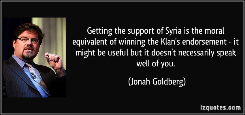 Getting the support of Syria is the moral equivalent of winning the Klan's endorsement - it might be useful but it doesn't necessarily speak well of you.
