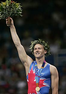 Kyle Keith Shewfelt (born May 6, 1982 in Calgary, Alberta) is a Canadian gymnast. His gold medal in the men's floor exercise competition at the 2004 Athens Olympics was the first medal ever by a Canadian in an artistic gymnastics event and was the first Canadian gold of the 2004 Olympics. He also has a vault named after him... (wikipedia)