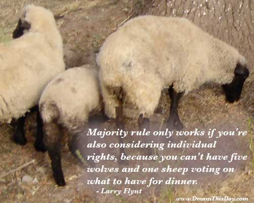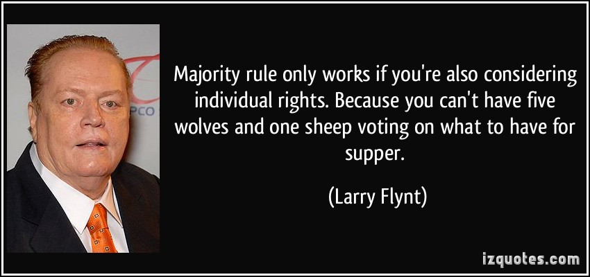 Majority rule only works if you're also considering individual rights. Because you can't have five wolves and one sheep voting on what to have for supper.