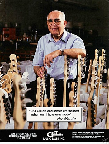 Clarence Leonidas "Leo" Fender was an American inventor who founded Fender Electric Instrument Manufacturing Company, or "Fender" for short. In January 1965, he sold the company to CBS and later founded two other musical instrument companies, Music Man and G&L Musical Instruments... (wikipedia)