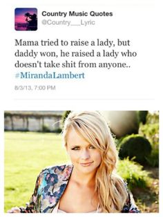 Miranda Leigh Lambert is an American country music artist who gained fame as a finalist on the 2003 season of Nashville Star, where she finished in third place and later signed to Epic Records. Lambert made her debut with the release of "Me and Charlie Talking", the first single from her 2005 debut album Kerosene. This album, which was certified Platinum in the United States, also produced the singles "Bring Me Down", "Kerosene", and "New Strings". All four singles were top 40 hits on Billboard Hot Country Songs... (wikipedia)