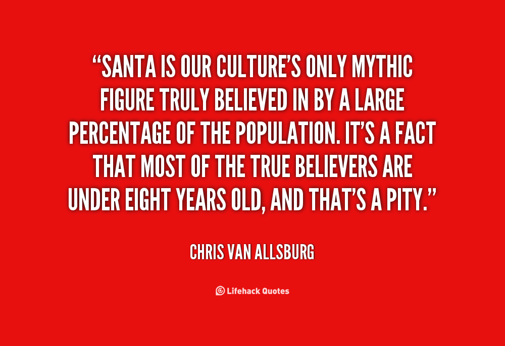 Santa is our culture's only mythic figure truly believed in by a large percentage of the population. It's a fact that most of the true believers are under eight years old, and that's a pity.