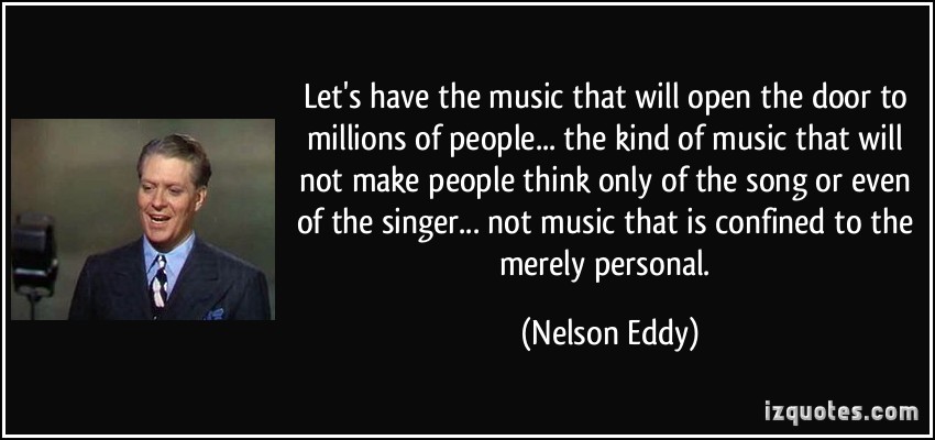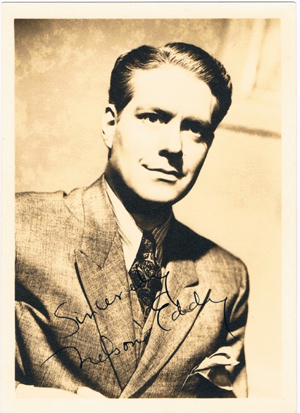Nelson Ackerman Eddy was an American singer and actor who appeared in 19 musical films during the 1930s and 1940s, as well as in opera and on the concert stage, radio, television, and in nightclubs. A classically trained baritone, he is best remembered for the eight films in which he costarred with soprano Jeanette MacDonald. He was one of the first "crossover" stars, a superstar appealing both to shrieking bobby soxers as well as opera purists, and in his heyday was the highest paid singer in the world... (wikipedia)
