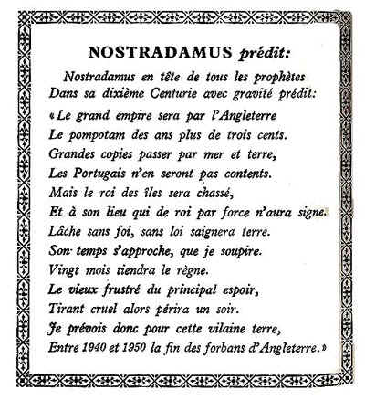Michel de Nostredame, usually Latinised as Nostradamus, was a French apothecary and reputed seer who published collections of prophecies that have since become famous worldwide. He is best known for his book Les Propheties, the first edition of which appeared in 1555. Since the publication of this book, which has rarely been out of print since his death, Nostradamus has attracted a following that, along with much of the popular press, credits him with predicting many major world events. Most academic sources maintain that the associations made between world events and Nostradamus's quatrains are largely the result of misinterpretations or mistranslations or else are so tenuous as to render them useless as evidence of any genuine predictive power... (wikipedia)