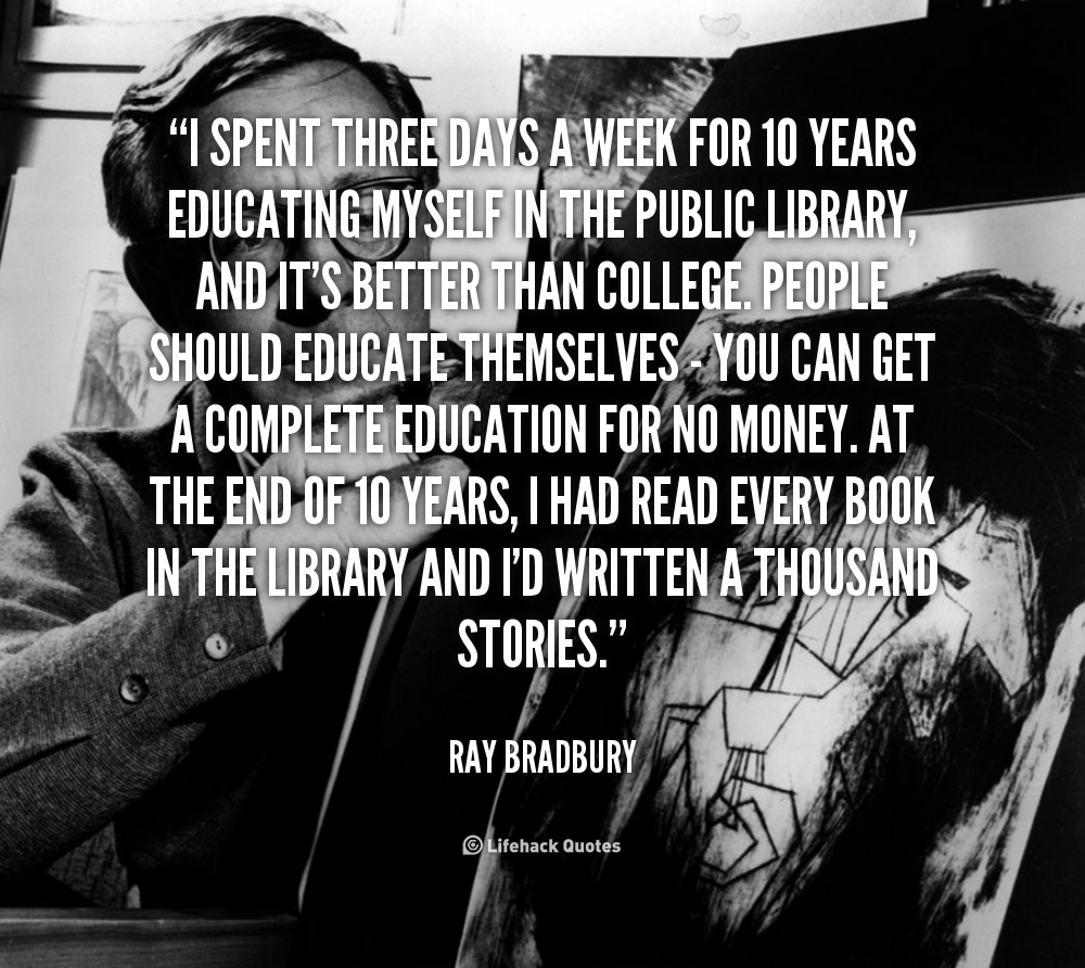 I spent three days a week for 10 years educating myself in the public library, and it's better than college. People should educate themselves - you can get a complete education for no money. At the end of 10 years, I had read every book in the library and I'd written a thousand stories.